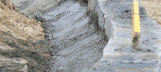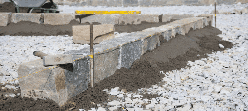 Setzten Sie weitere Randsteine aus Granit und bringen Sie diese in Ihre endgültige Position. Nachdem Sie weitere Randsteine platziert haben, richten Sie die Rückenstütze aus. Dies sollte erfolgen, bevor der Mörtel aushärtet. Die Rückenstütze sollte ein Drittel der Höhe der Randsteine betragen. Tragen Sie den Beton in keilförmiger Form an den Randsteinen auf und drücken Sie ihn fest mit der Kelle.