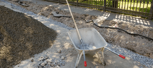 Anschließend verteilen Sie eine Schicht aus Sand oder Kies gleichmäßig mit einem Rechen in der Einfassung. Diese Schicht mit einer Höhe von etwa 10 cm dient als Frostschutz, die Sie mit einer Rüttelplatte oder einem Handstampfer verdichten.